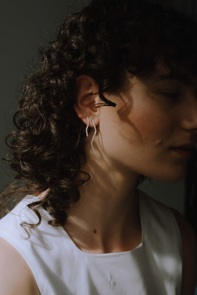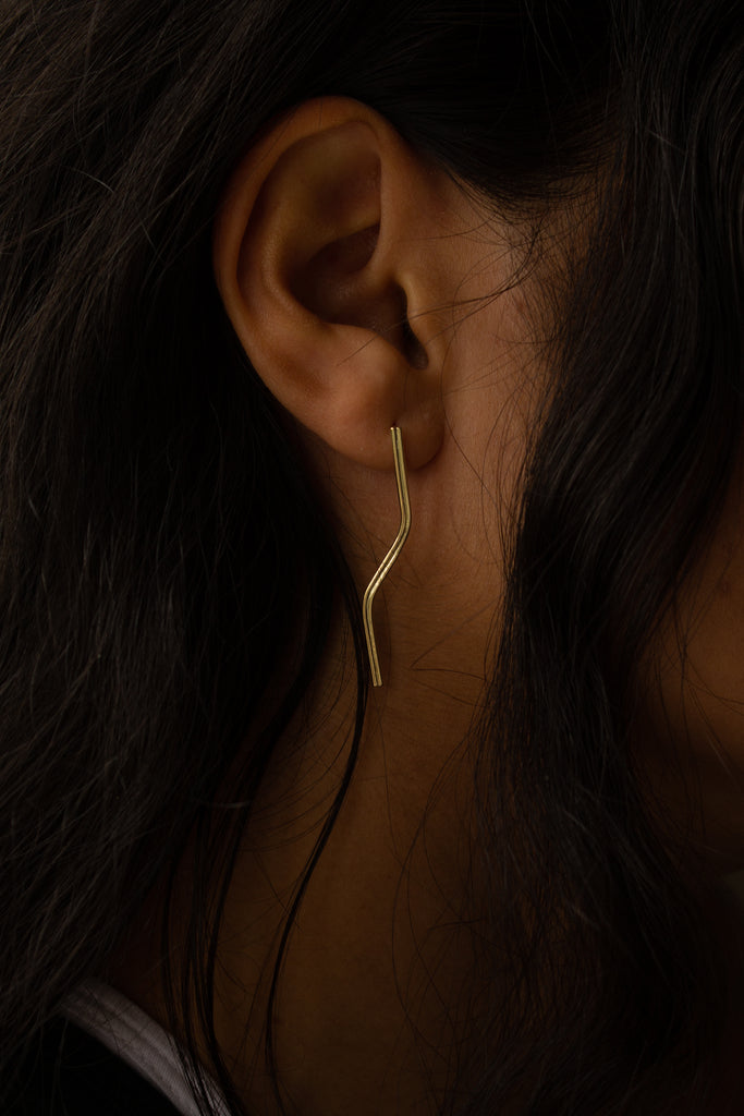 The ‘River Drop Large’ is a larger offset of the River drop design. Elongating the design allows for a bold aesthetic, working in combination with the smaller piece to add asymmetry and structure. Sold as a pair.